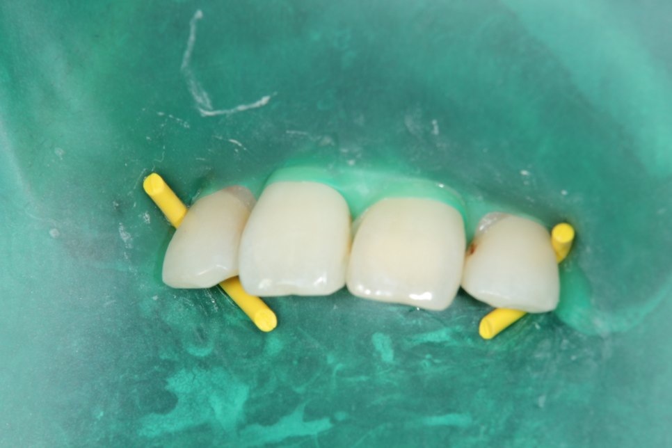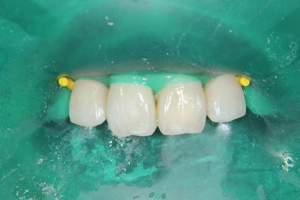 前歯の虫歯です。唾液の量が多い方や歯ぐきから出血がある方にはラバーダム防湿法を使います。このように緑色のゴムのシートを使用して、歯に唾液や血液が付かない様にします。