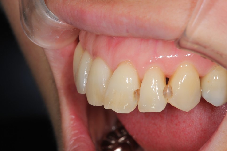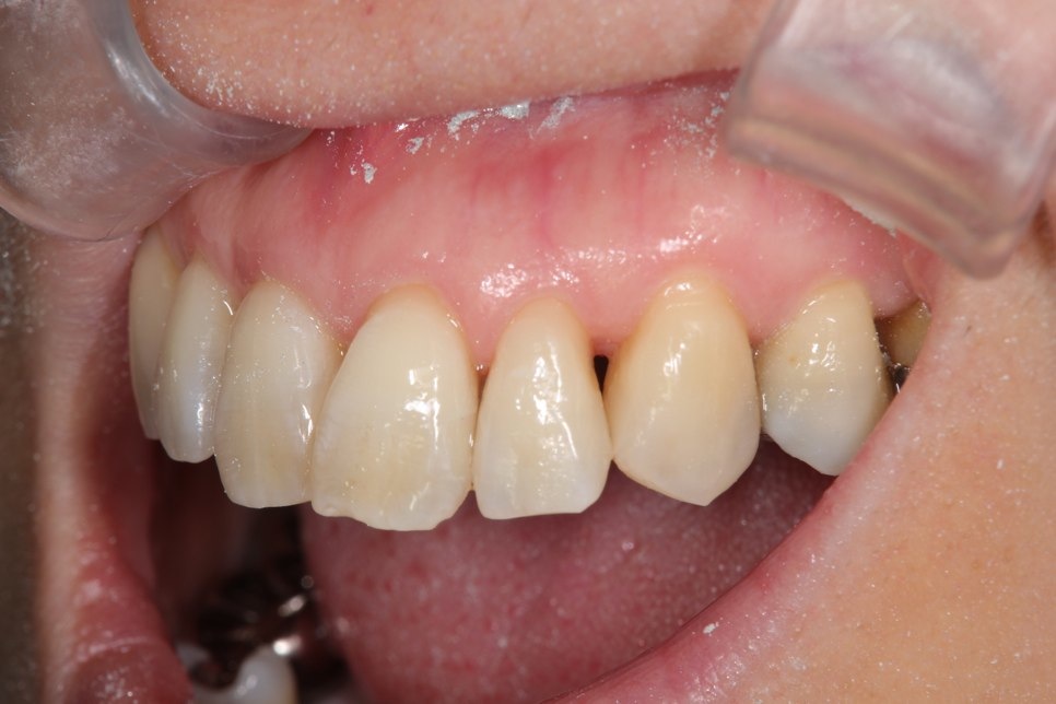 白い詰め物と虫歯になった歯のみを取り除きます。通常でしたら型とりを行い、健康な歯まで削って治療する事になります。今回は最小限度しか削ってません。