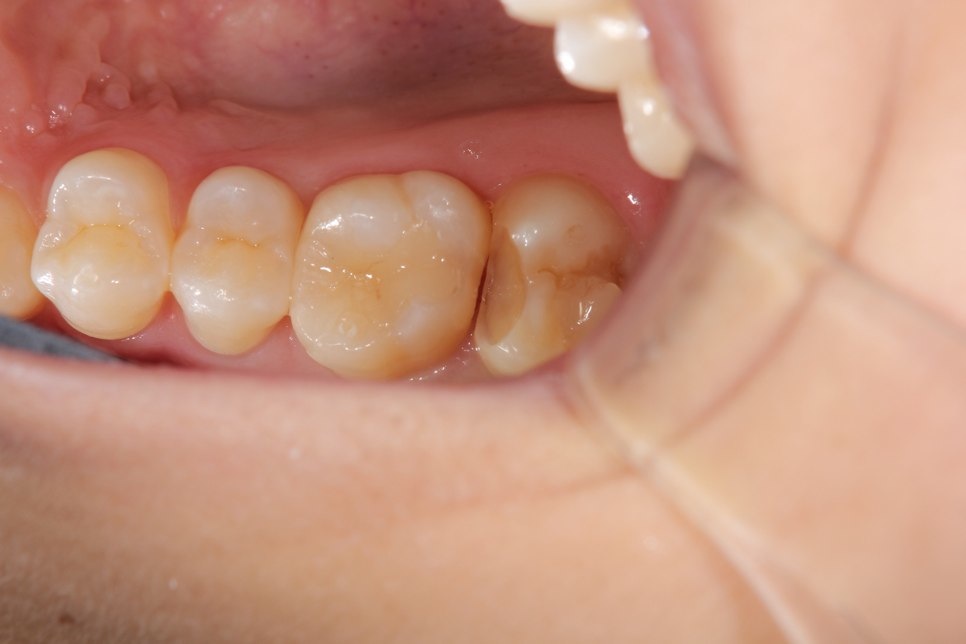 奥歯がしみるとの事でした。一見分かりませんが拡大鏡で確認して行くと虫歯が見つかりました。