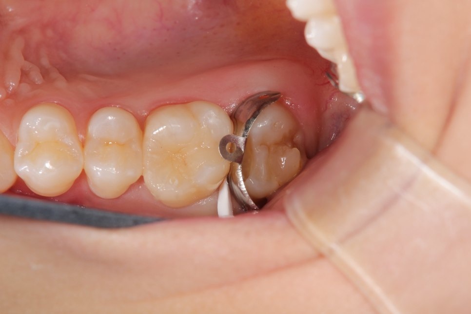 ここにマトリックスという金属製の薄い器具を入れて行き歯の形をなるべく再現できる様にします。