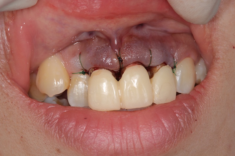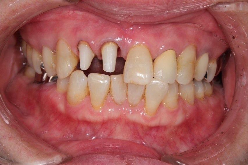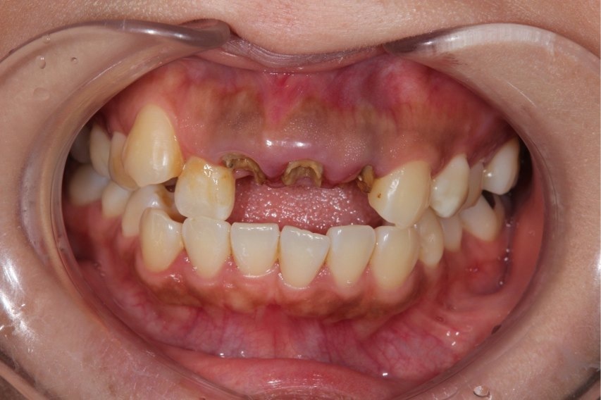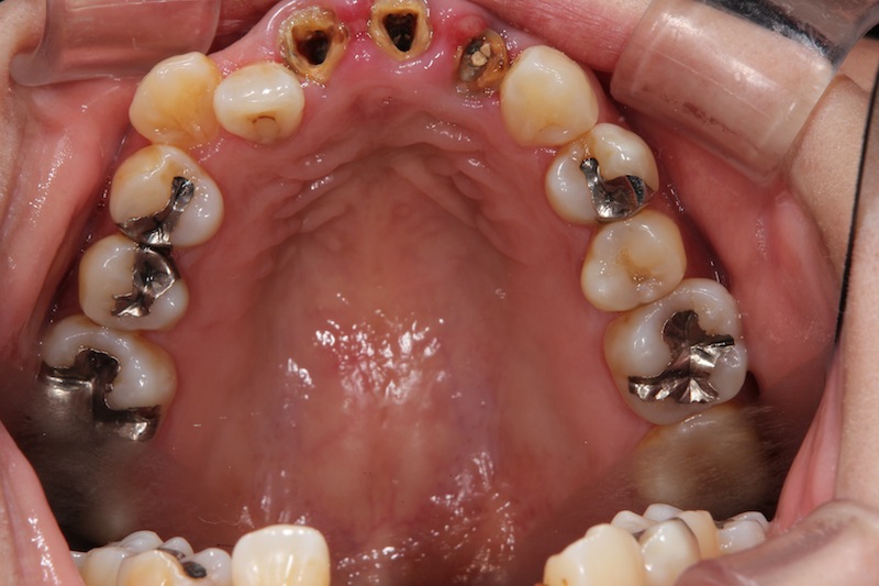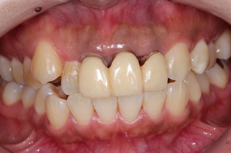 前歯が取れた患者様です。元々セラミックの歯が入っていましたが、中で虫歯が進み、ついに歯が取れてしまいました。