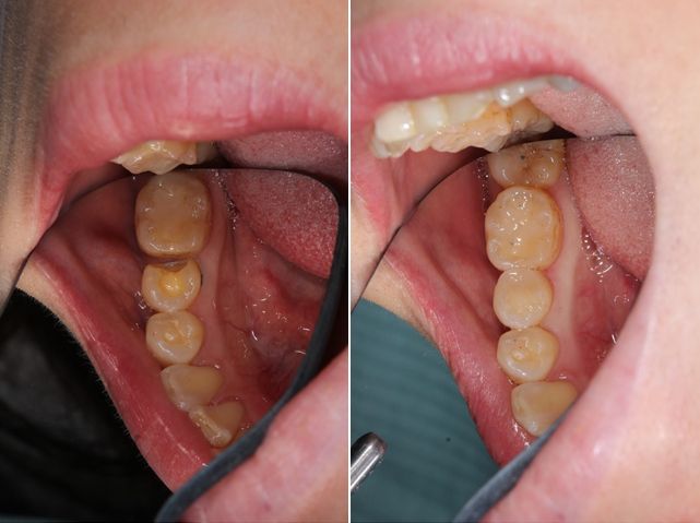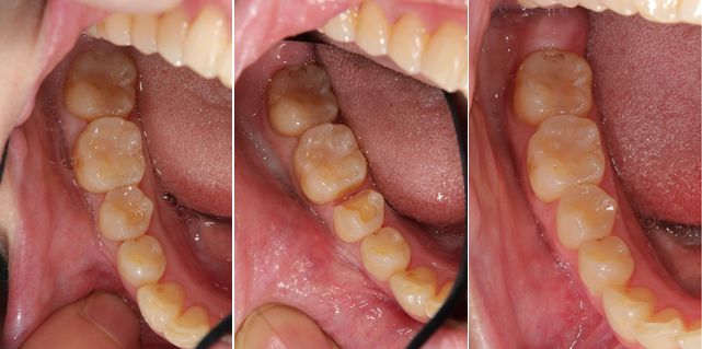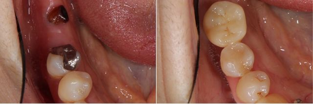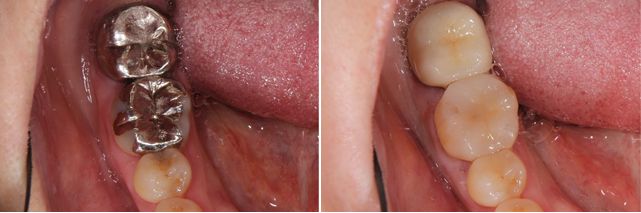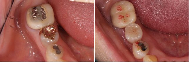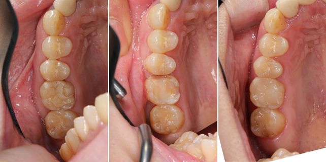 ハイブリッドインレーが劣化してやり変える事になりました。左の写真で歯との隙間、透明感、歯の色において悪くなってきています。このままでは、歯にダメージを与えてしまいます。オールセラミックインレーでの治療後の写真が右です。透明感もあり歯と同化しています。変色もしない為、半永久的にお口の中で機能し続けます。