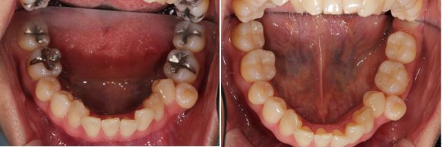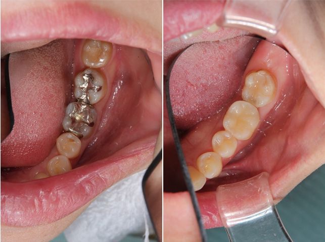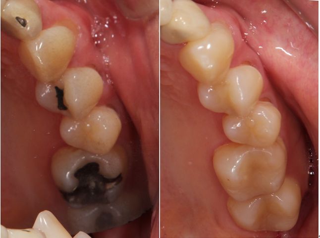 術前術後です。奥歯2本をオールセラミックインレーで治療しました。手前の銀歯はダイレクトボンディングを行いました。