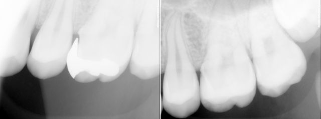 その時のレントゲン写真です。銀歯の時は歯との隙間がずいぶん大きい事がわかります。セラミックインレーに変えて歯との隙間もなくなり、今後はいい状態が保てます。